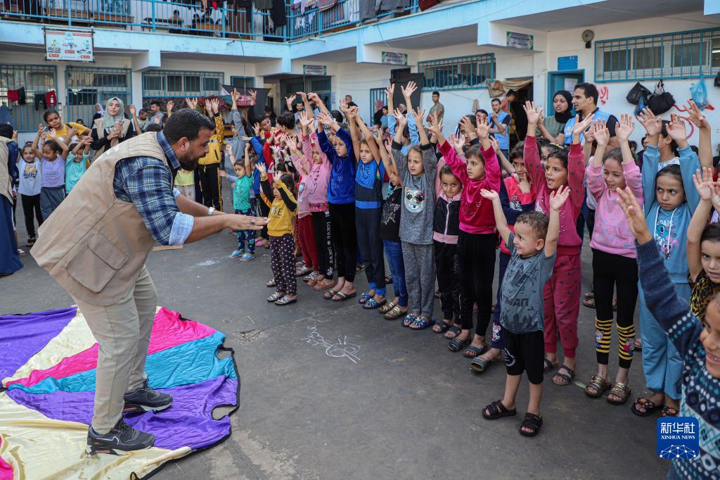 當日,在加沙地帶南部城市汗尤尼斯的一所聯合國近東巴勒斯坦難民救濟和工程處附屬學校內,當地誌願者組織多種活動,關愛流離失所的兒童,撫慰戰事創傷。新一輪巴以衝突爆發一個月來,加沙地帶已有超過1萬人死亡,其中大約40%是兒童。