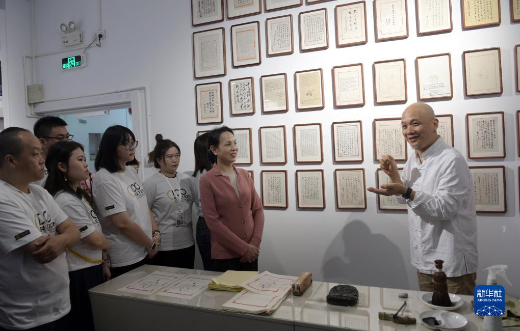當日,十竹齋木版水印藝術作品展在暨南大學廣州石牌校區舉行。國家非遺項目木版水印技藝代表性傳承人魏立中在展覽現場為學生導賞、授課,並指導學生體驗木版水印手作的樂趣。