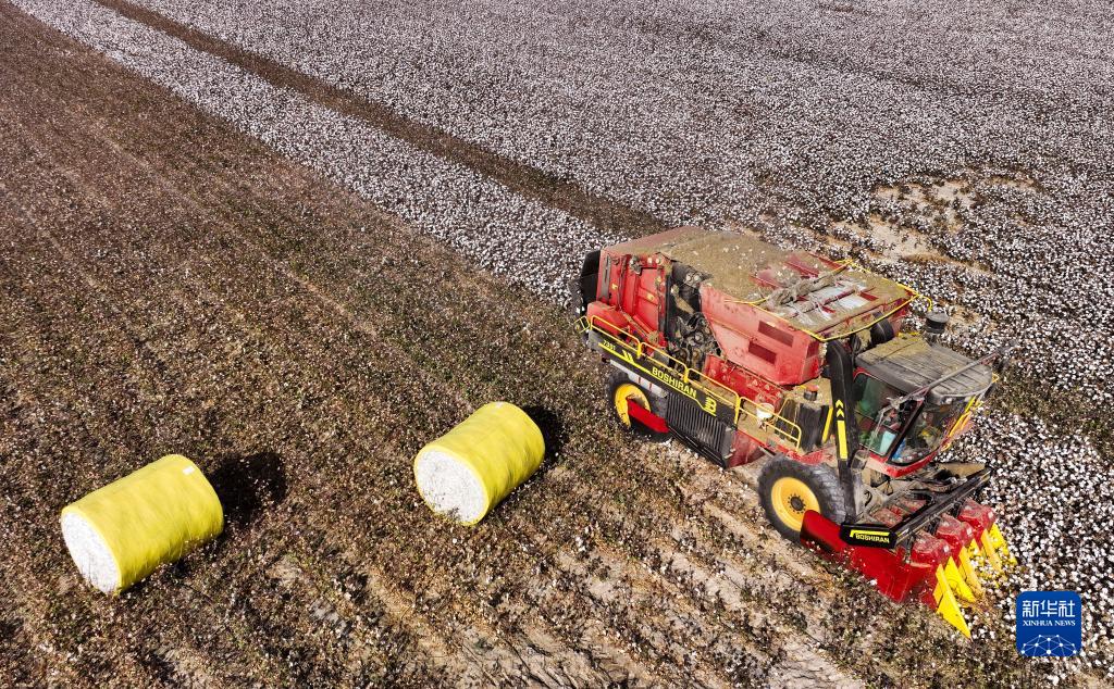 在新疆尉犁縣巴西買裏村,農機手駕駛採棉機在爾肯家的棉田中作業(10月24日攝,無人機照片)。
