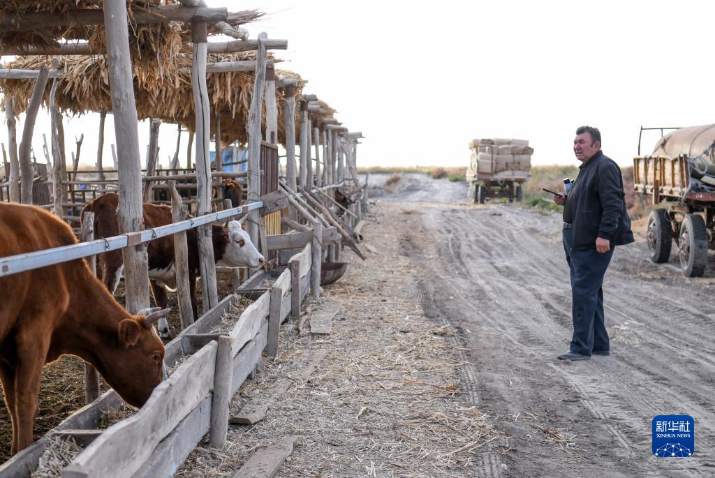在新疆尉犁縣巴西買裏村,爾肯查看自家養的牛(10月19日攝)。