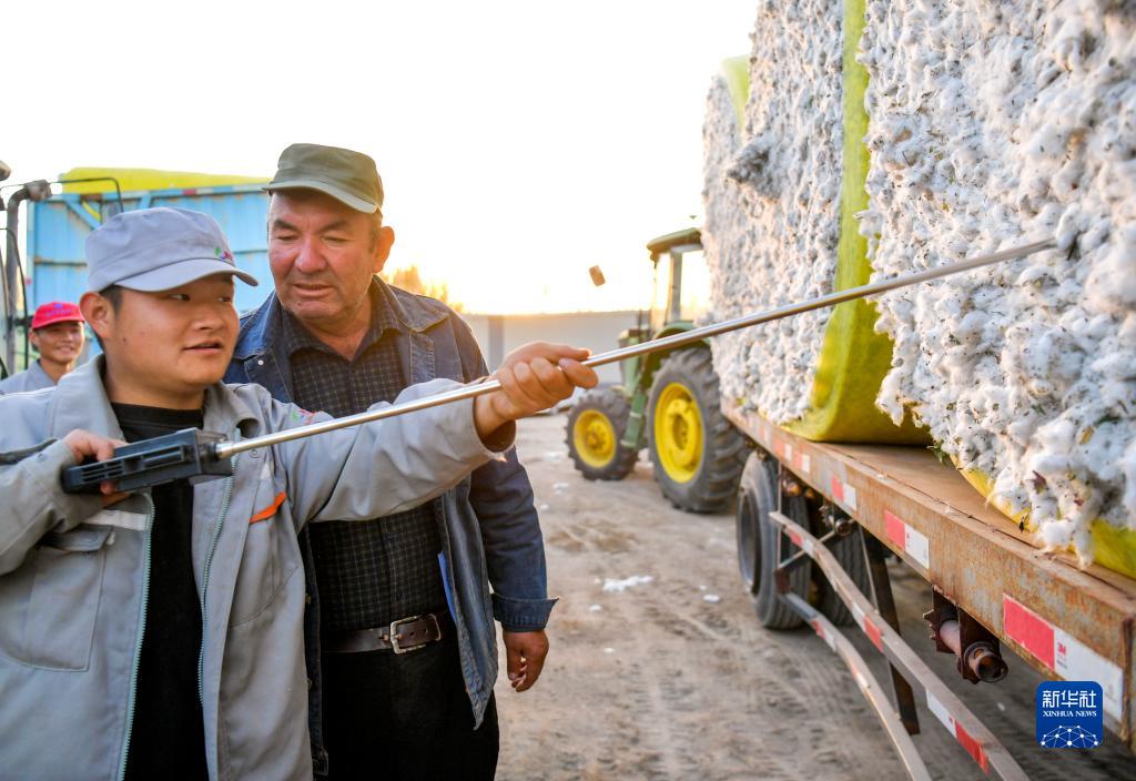 在新疆尉犁縣一家棉花加工廠外,爾肯(右)陪着工作人員檢測自家棉花濕度(11月1日攝)。