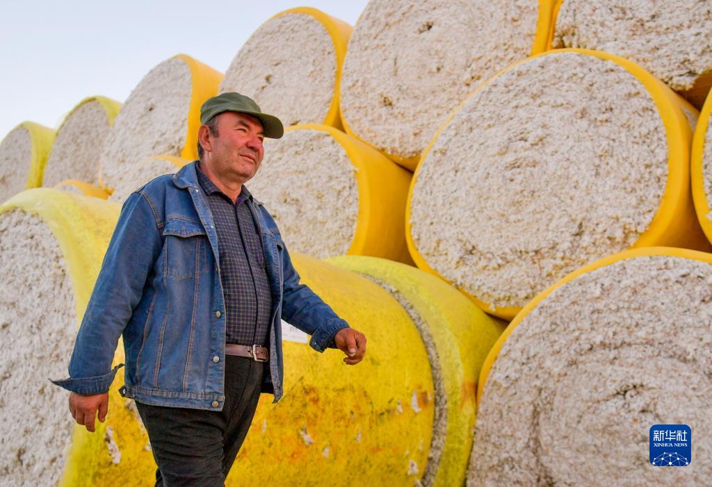 在新疆尉犁縣一家棉花加工廠內,爾肯看著自家棉花擺放整齊後離開廠區(11月1日攝)。