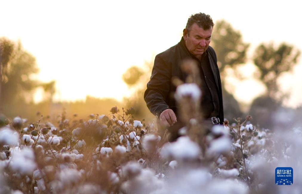 在新疆尉犁縣巴西買裏村,爾肯在自家的棉田中查看棉花(10月20日攝)。