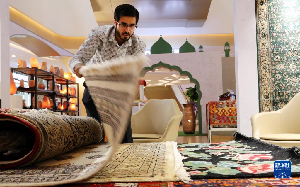 哈比在位於上海綠地貿易港的商鋪內整理地毯(2021年9月7日攝)。