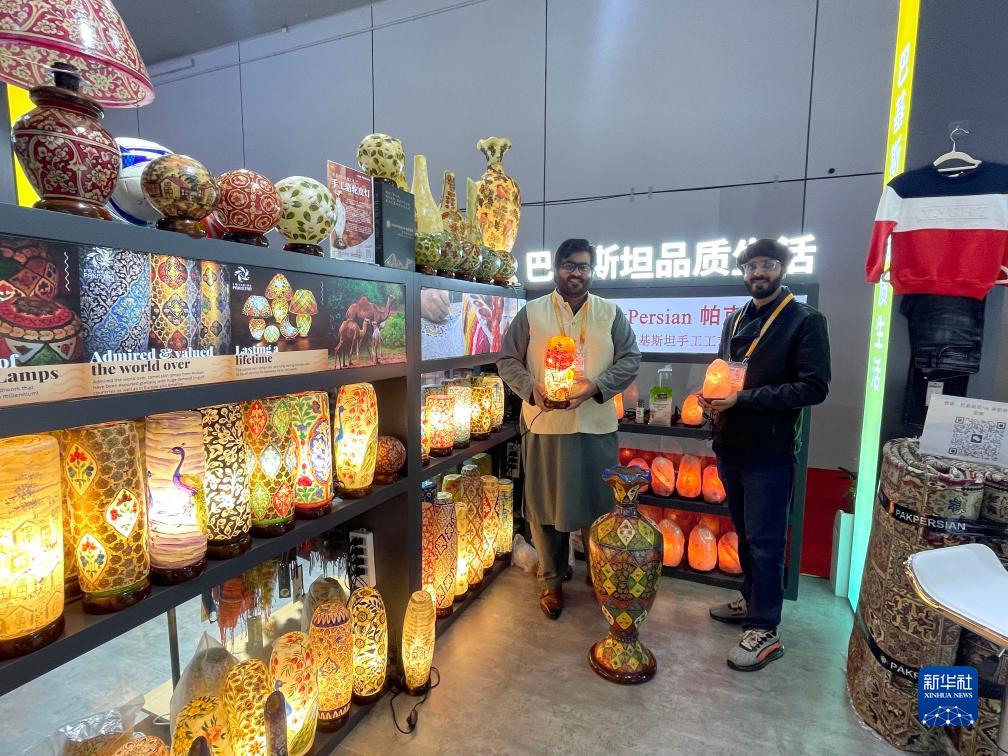 11月8日,在第六屆進博會食品及農展品展區,手持駱駝皮燈的李明(左)和手持鹽燈的哈比站在攤位前。