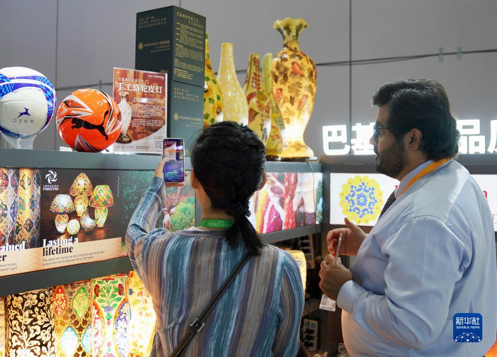11月6日,在第六屆進博會食品及農展品展區,參觀者在李明(右)的引導下,掃描二維碼關注巴基斯坦手工藝品淘寶店舖。