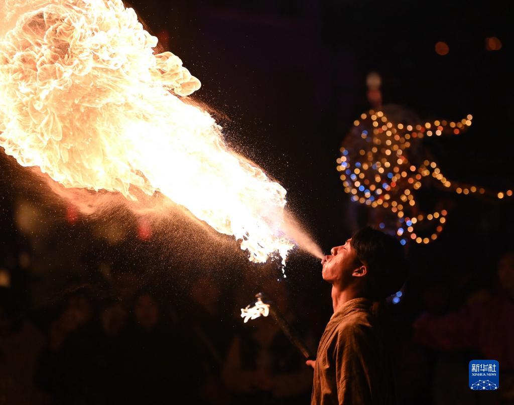 演員在約特幹故城表演“噴火”(11月7日攝)。