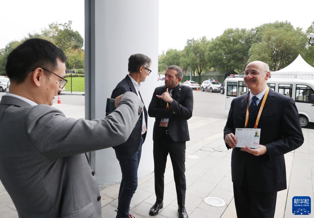 11月9日,同伴用手機幫手持簽證回執的意大利參展商弗朗切斯科(右)拍照。