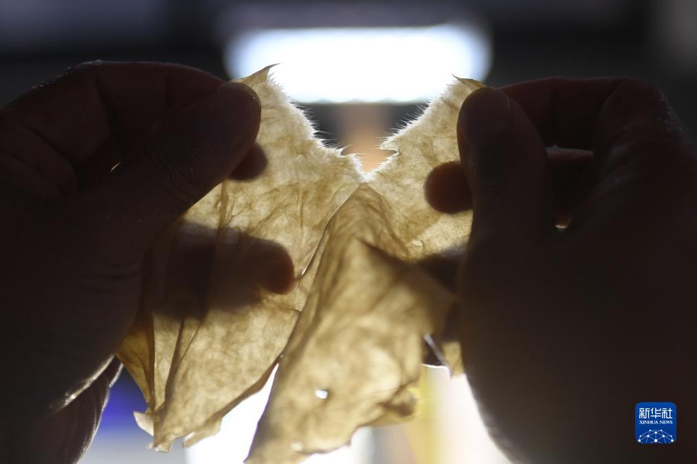 11月9日,在開化紙傳統技藝工坊,黃宏健展示開化紙的纖維長度。