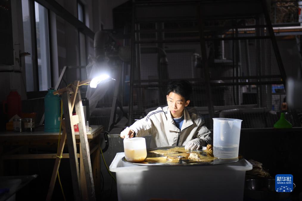 11月9日,工作人員在開化紙傳統技藝工坊制紙。