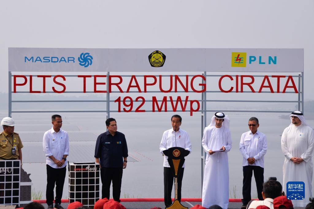 11月9日,印度尼西亞總統佐科(中)在西爪哇省芝拉塔水庫旁出席並網發電儀式。