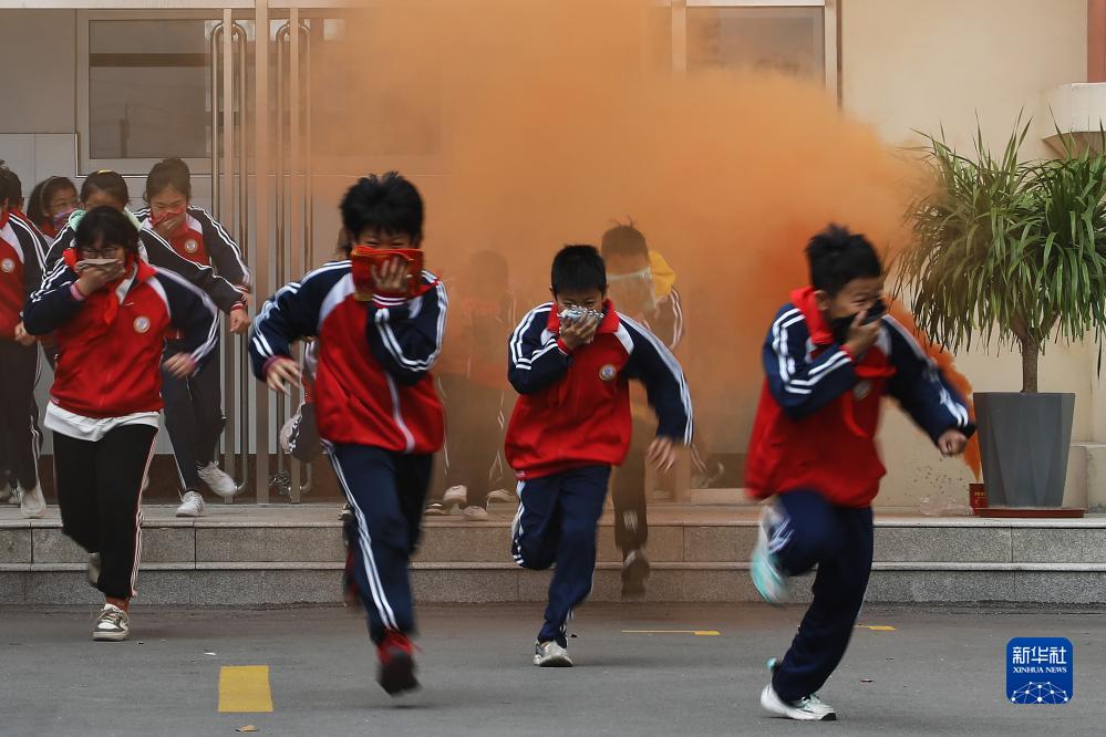 11月9日,山東省滕州市紅荷路實驗小學學生在進行“火災”逃生演練。