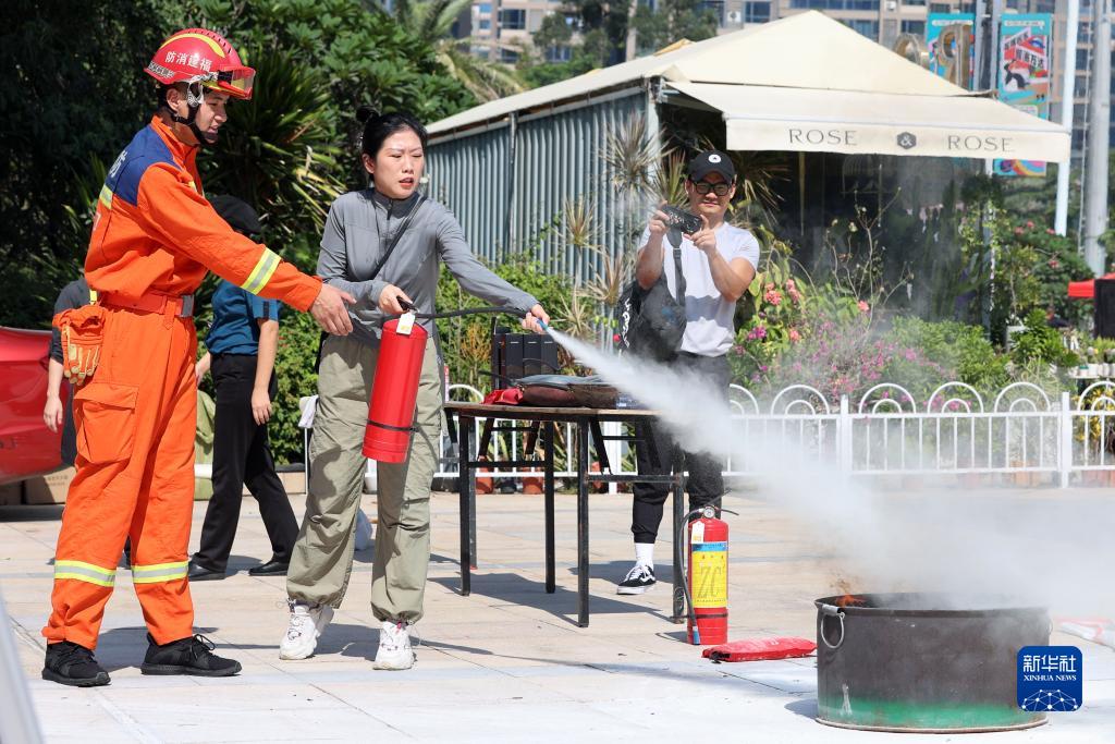 11月9日,在福建省廈門市湖裏區,市民在消防員的指導下體驗使用滅火器。