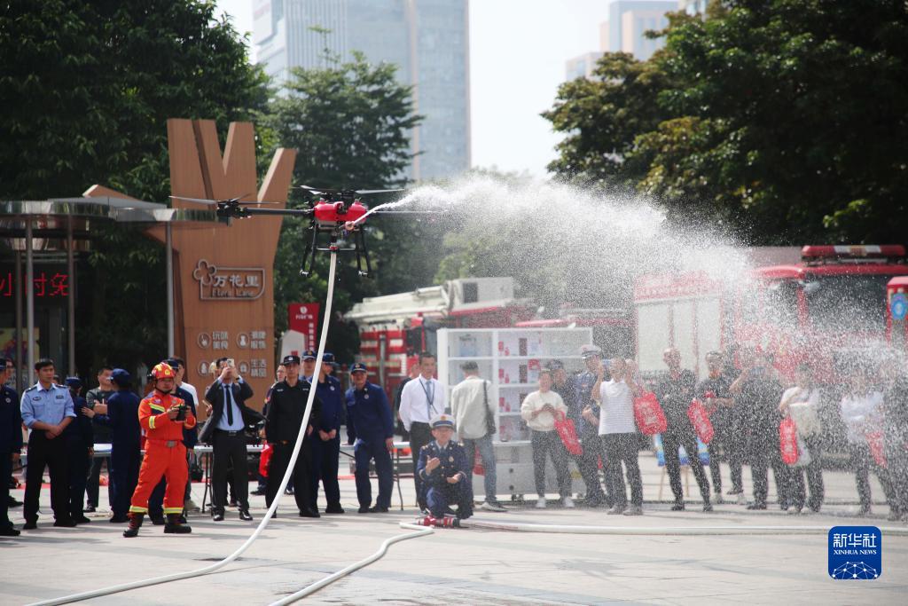 11月9日,在福建省龍岩市萬寶廣場,消防員向市民演示無人機高空滅火。