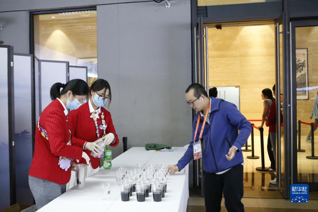 11月7日,上海杉達學院志願者在新聞中心餐廳提供餐飲服務。