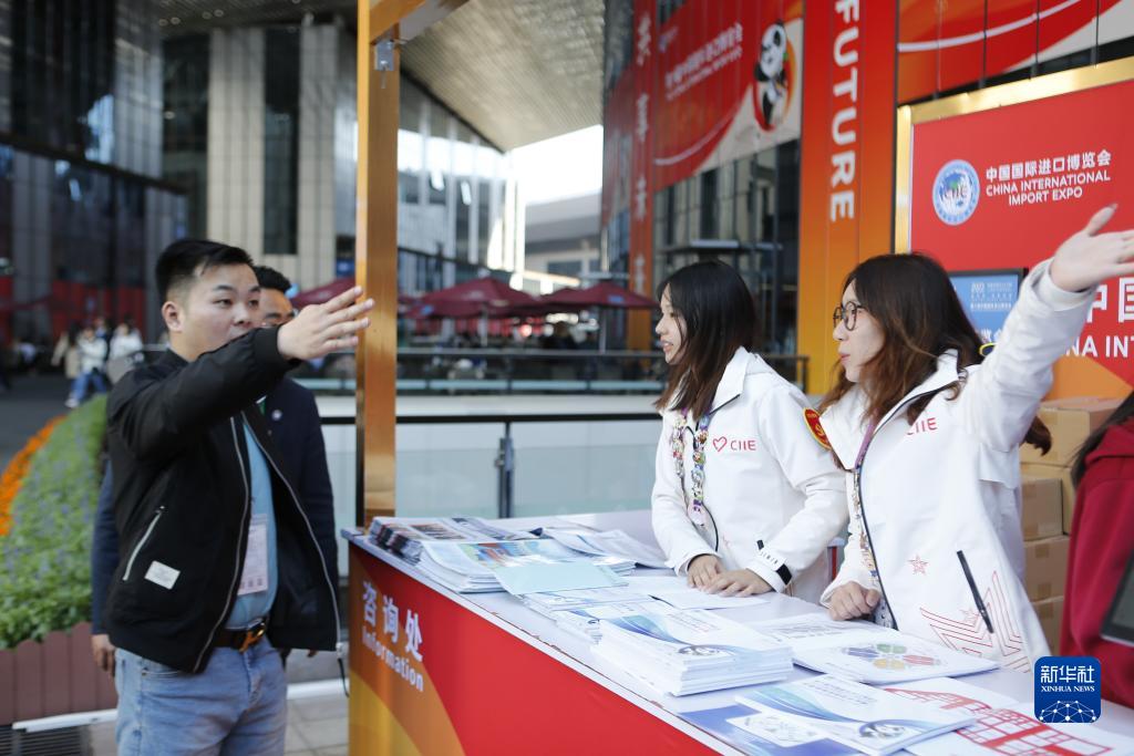 11月7日,在國家會展中心(上海),志願者為參觀者指路。