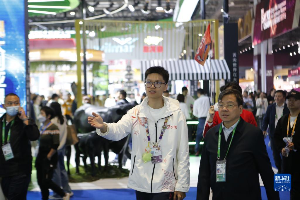 11月7日,在第六屆進博會上,上海理工大學志願者鄭子鋒(左)在引導交易團參觀。