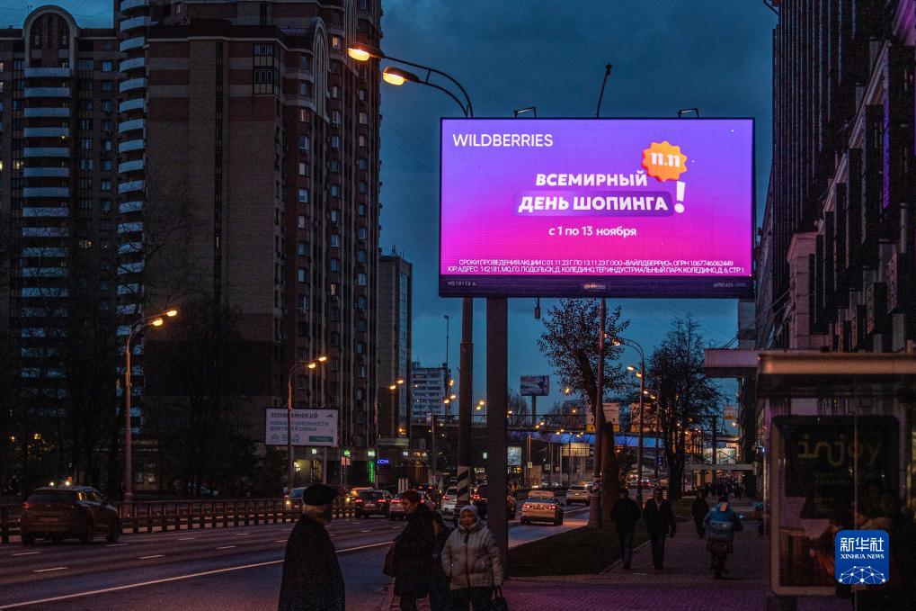 11月8日,在俄羅斯首都莫斯科,行人在播放電商平台“雙十一”促銷廣告的顯示屏前走過。