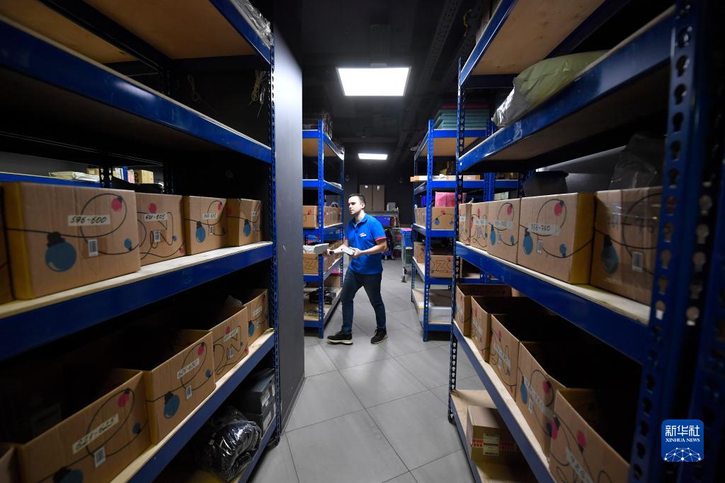 11月8日,在俄羅斯首都莫斯科,工作人員在一家電商平台倉庫內分揀貨物。