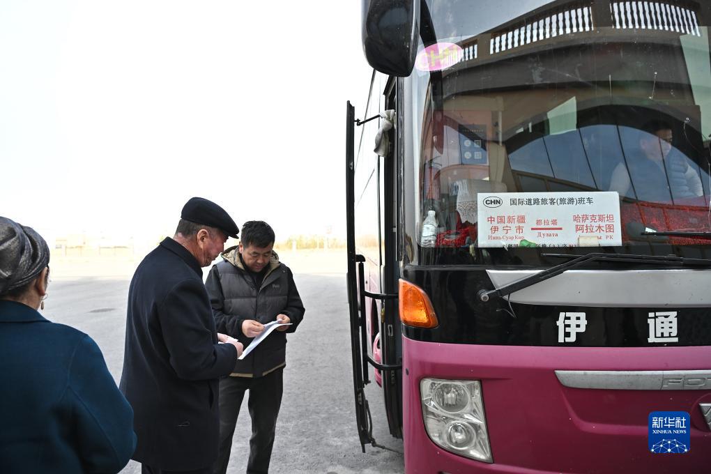 11月9日,游客在都拉塔口岸國際汽車客運站檢票登上前往哈薩克斯坦的客車。