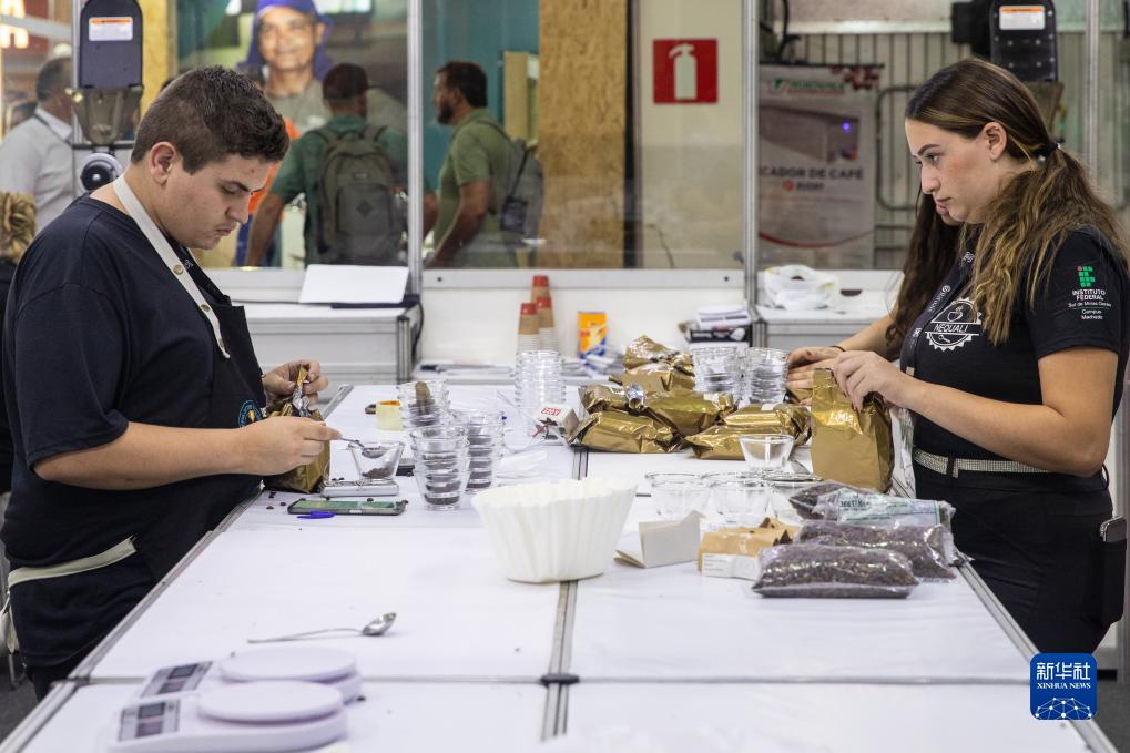 11月9日,在巴西貝洛奧裏藏特舉行的咖啡周上,工作人員包裝咖啡。