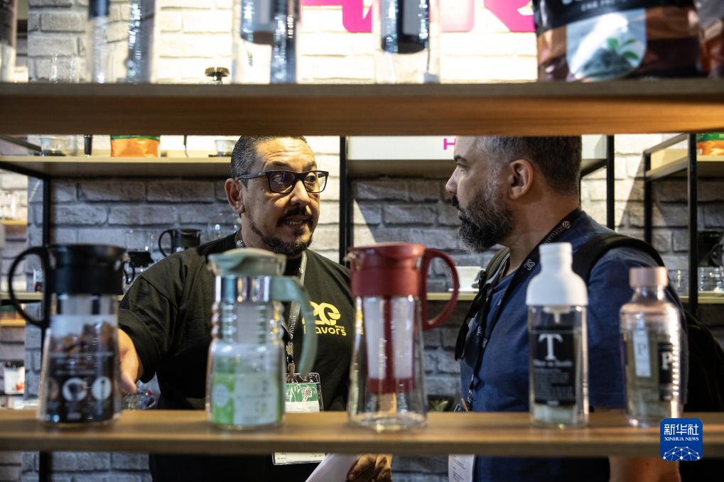 11月9日,工作人員在巴西貝洛奧裏藏特的咖啡周上為參觀者介紹咖啡器具。
