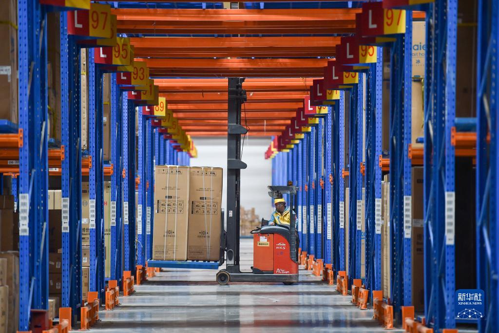 11月10日,在位於江蘇省南京市江寧區的蘇寧華東物流中心,工人駕駛叉車運輸商品。