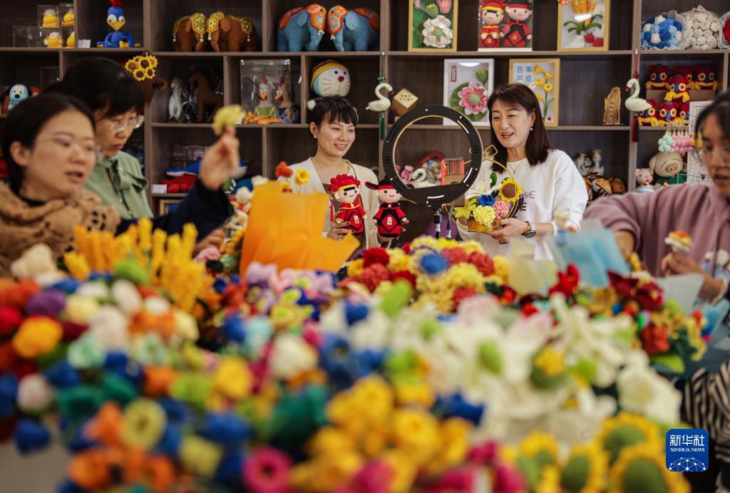 11月9日,山東省榮成市巾幗創業孵化基地,婦女創客在包裝毛線編織手辦、花束訂單。