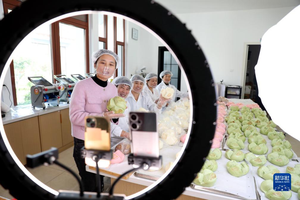 11月8日,山東省青島西海岸新區海青鎮共富電商直播基地,志願者在直播售賣海青花饃。