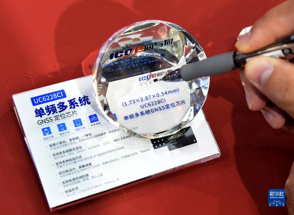 11月10日,一名參展商介紹基於北斗技術的國産微型定位芯片。