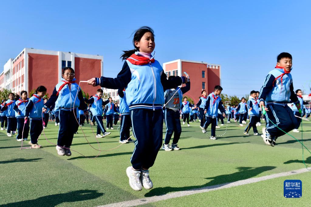 11月10日,在日照市莒縣洛河鎮中心小學,同學們在陽光大課間參加跳繩活動。