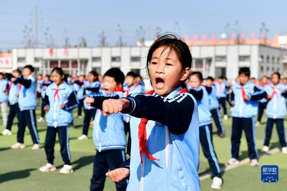 11月10日,在日照市莒縣洛河鎮中心小學,同學們在陽光大課間參加武術健身操活動。