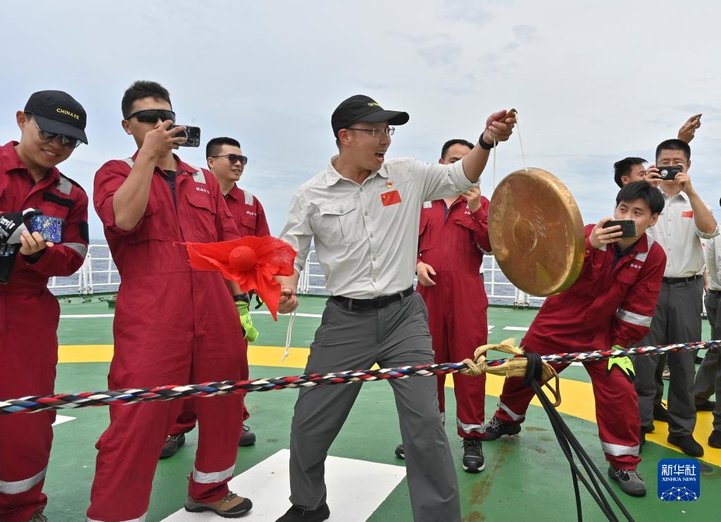 11月10日,中國第40次南極考察隊在“雪龍2”號上舉行穿越赤道紀念活動。圖為考察隊副領隊魏福海敲鑼宣布拔河比賽開始。