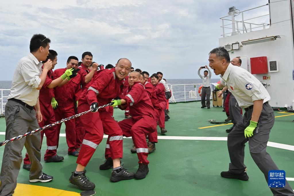 11月10日,中國第40次南極考察隊在“雪龍2”號上舉行穿越赤道紀念活動。圖為隊員參加拔河比賽。