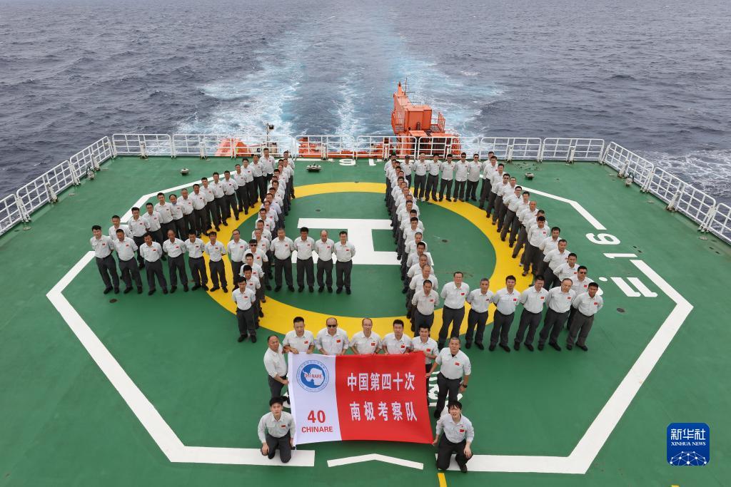 11月10日,中國第40次南極考察隊在“雪龍2”號上排列成“40”字樣的隊形合影留念。