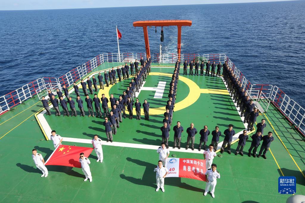 11月8日,中國第40次南極考察隊在“雪龍”號上排列成“40”字樣的隊形。