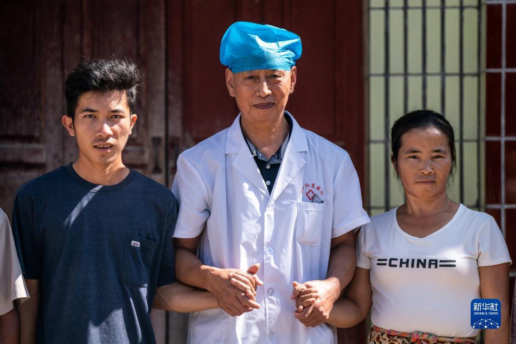 在瑞麗市畹町鎮混板村委會弄片村民小組,沈坤在家訪後與村民合影(10月28日攝)。他在二十年前接生的小男孩(左)已長大成人。