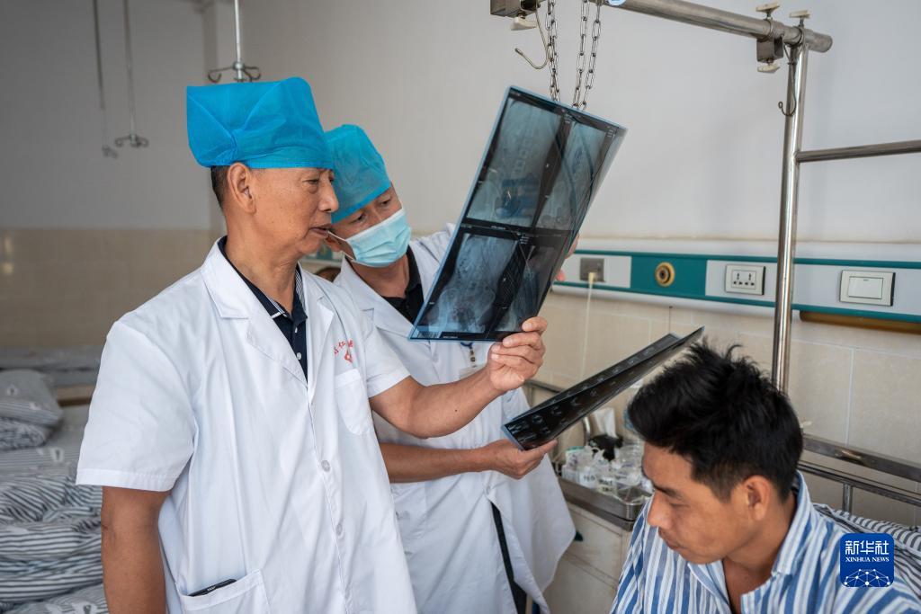 在畹町仁慈醫院,沈坤(左)在查房時查看病人病情(10月29日攝)。