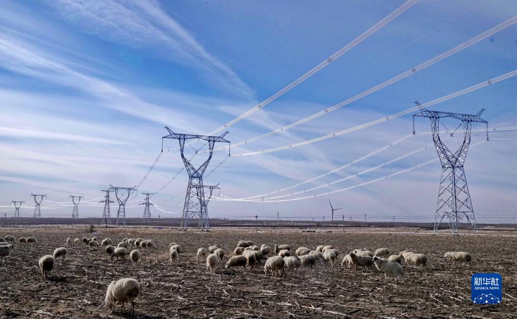 11月10日,一群羊在河北省康保縣丹清河鄉境內的張北至勝利雙回1000千伏特高壓線路工程冀北段建設工地附近覓食。