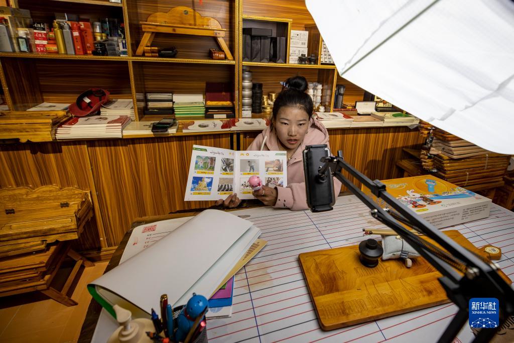 西藏拓崗文化傳播有限公司主播索朗德吉在直播銷售藏語學習文具(11月10日攝)。