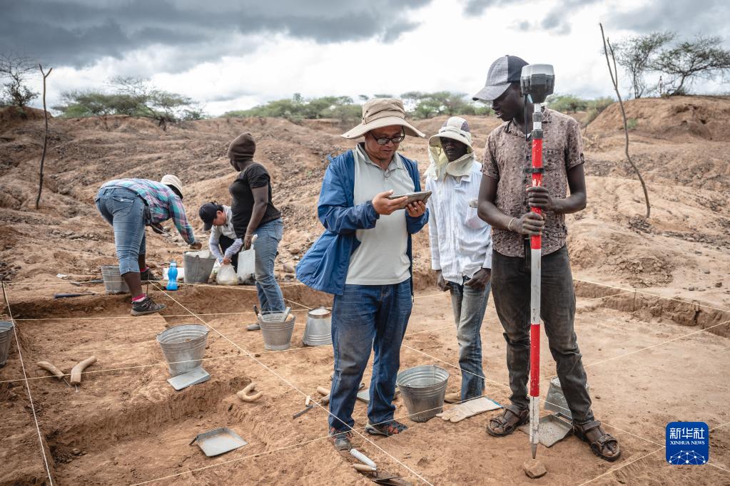 11月3日,中肯聯合考古隊隊員顧雪軍(右三)在位於肯尼亞巴林戈郡馬里加特鎮的考古現場測量石器坐標位置。