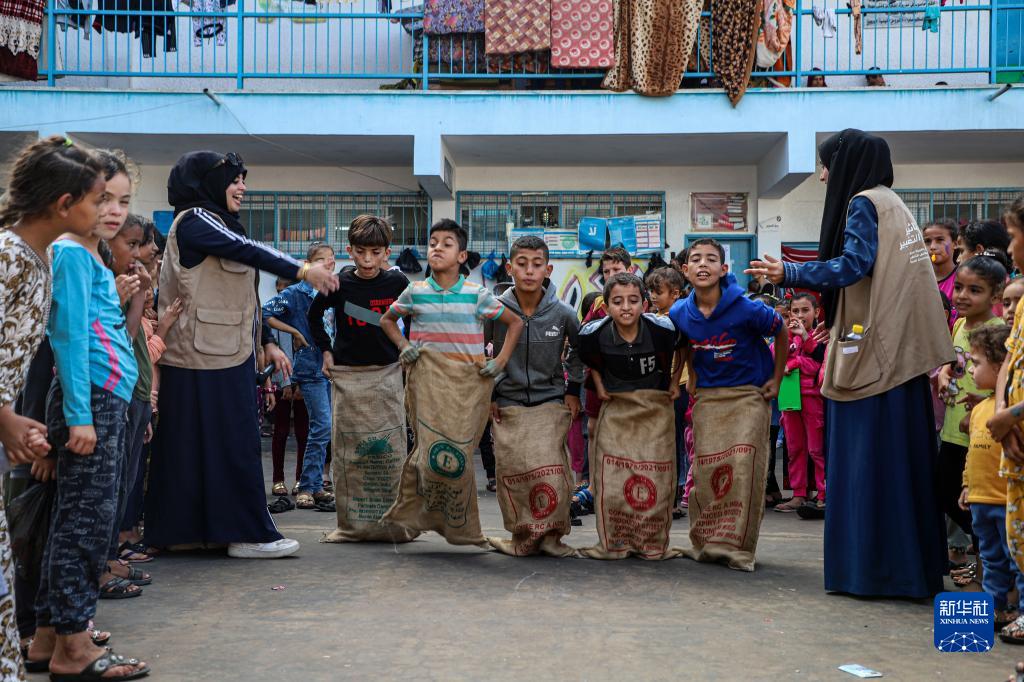 當日,在加沙地帶南部城市汗尤尼斯的一所聯合國近東巴勒斯坦難民救濟和工程處附屬學校內,當地誌願者組織多種活動,關愛流離失所的兒童,撫慰戰事創傷。新一輪巴以衝突爆發一個月來,加沙地帶已有超過1萬人死亡,其中大約40%是兒童。