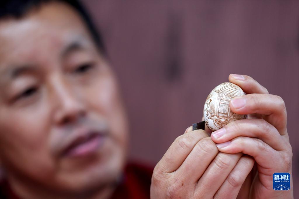 11月10日,非遺傳承人王劍在第六屆中國非物質文化遺産傳統技藝大展上展示“廬州蛋雕”非遺傳統技藝。