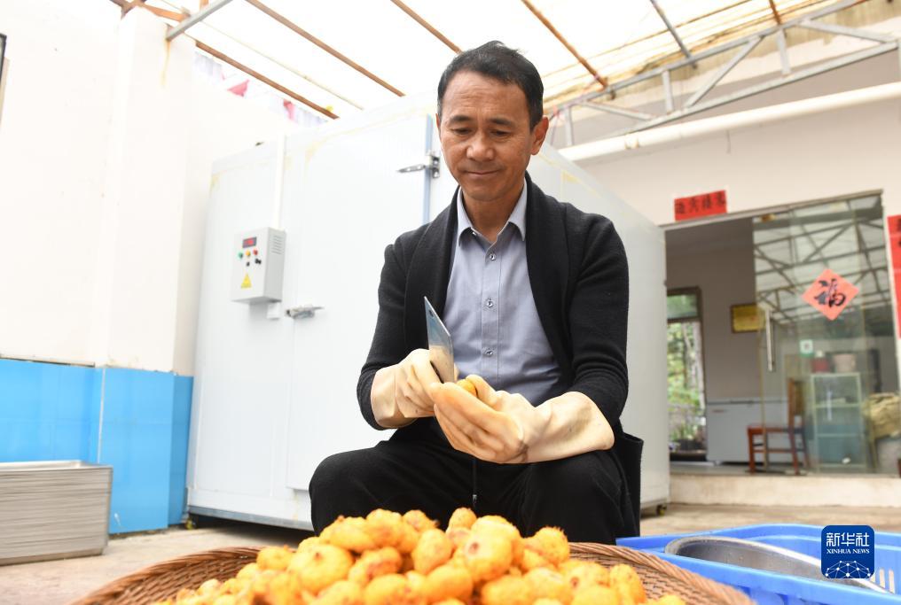 11月8日,貴州龍裏縣谷腳鎮茶香村刺梨種植大戶燕啟富給刺梨切片。