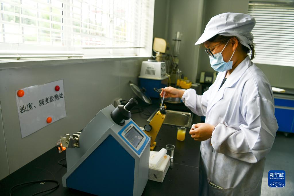 貴州省龍裏縣高新技術産業園區一家刺梨加工企業的員工檢查刺梨的濁度和糖度(2021年8月19日攝)。