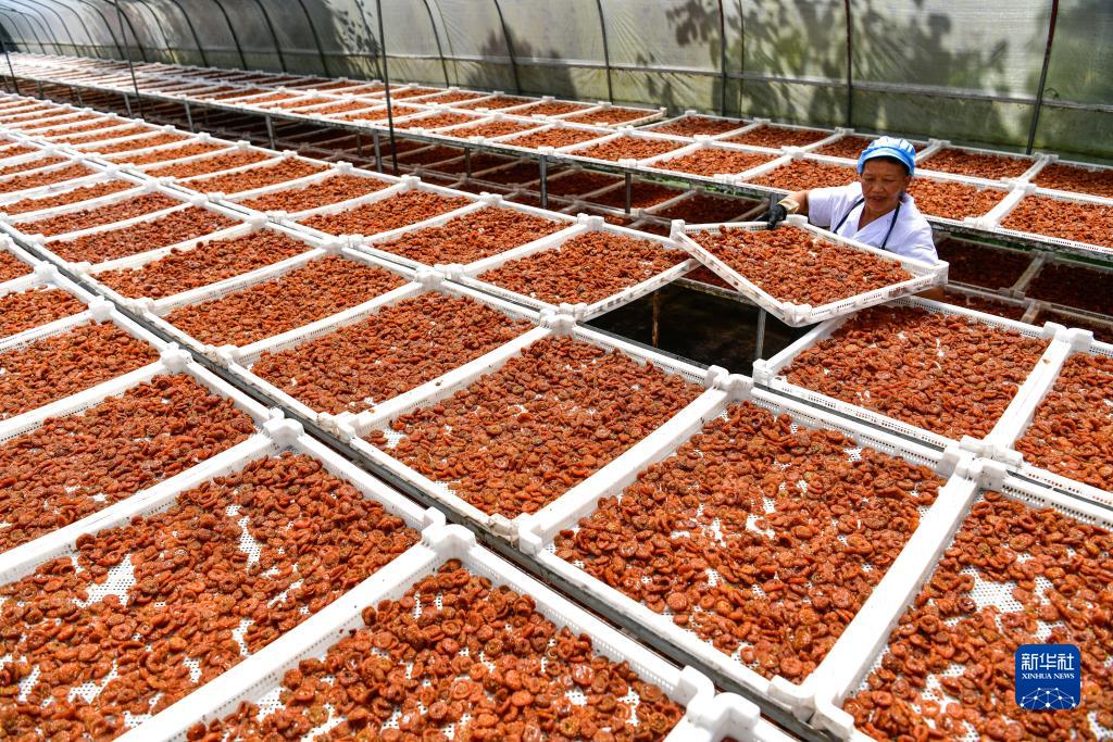 農民在貴州省龍裏縣谷腳鎮高堡村晾曬刺梨果脯(9月1日攝)。