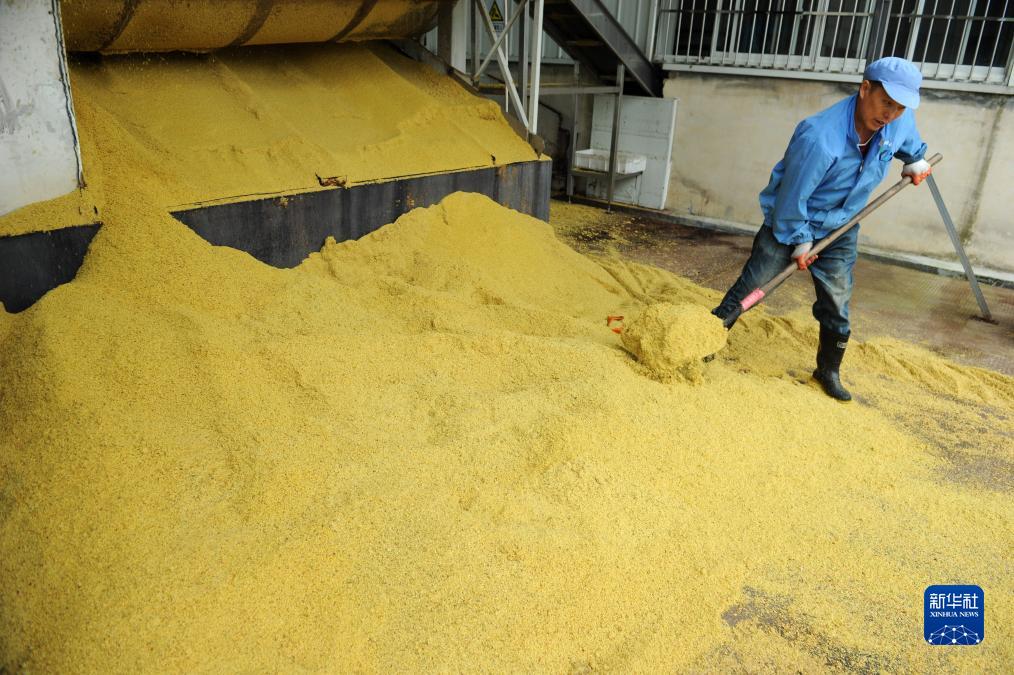 貴州省龍裏縣高新技術産業園區一家刺梨加工企業的工人對刺梨渣進行回收再利用(2018年8月23日攝)。