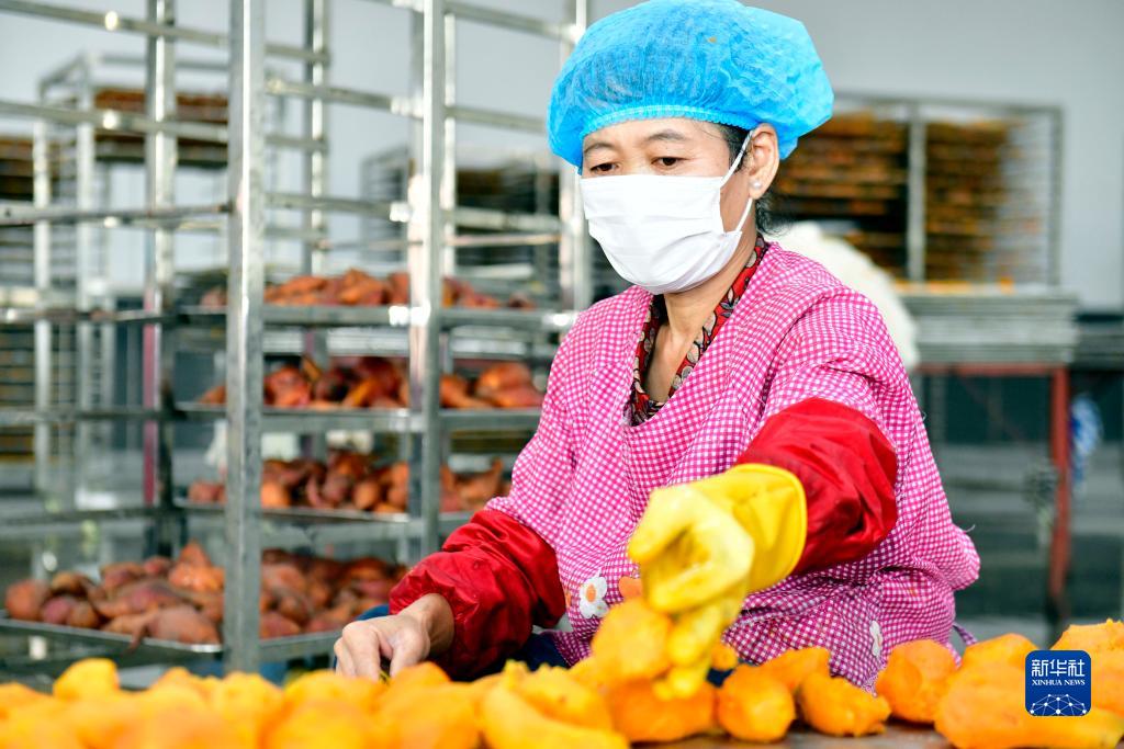11月11日,在五蓮縣潮河鎮魏家薯幹專業合作社,工作人員在加工薯幹。