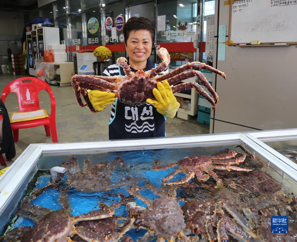 11月10日,在韓國釜山機張郡附近,一名水産商人展示售賣的帝王蟹。