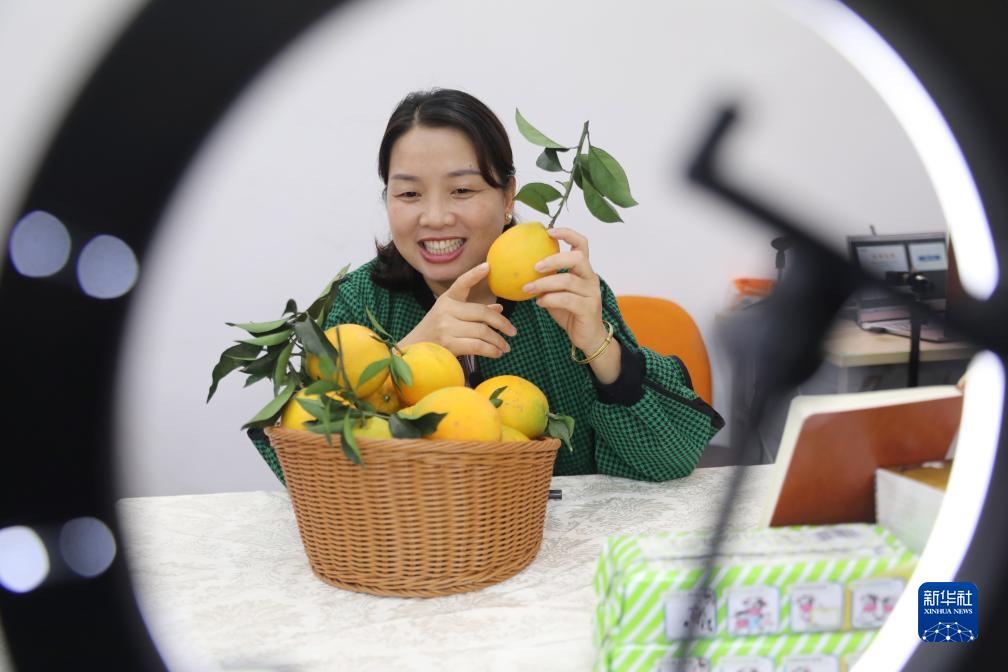 11月11日,在湖南省永州市道縣道滋味有限責任公司,主播在網絡平台上推廣當地臍橙。